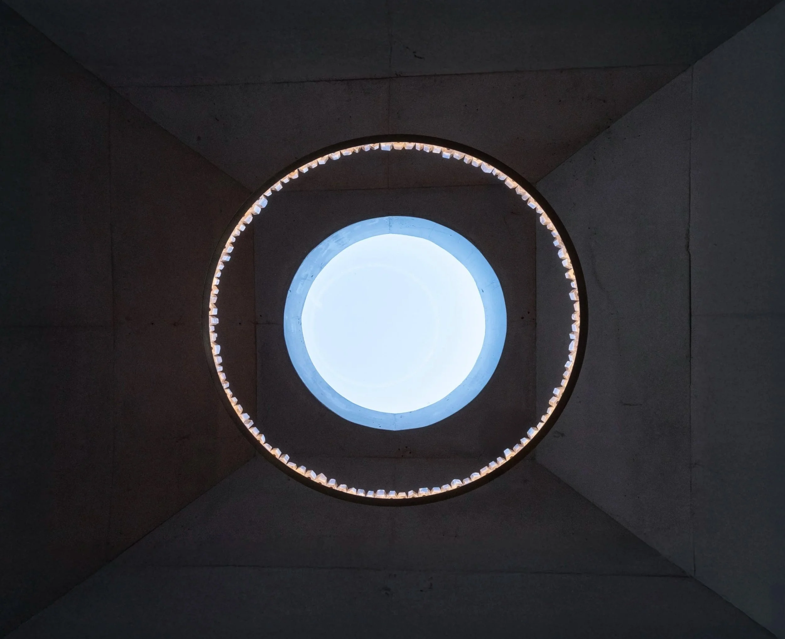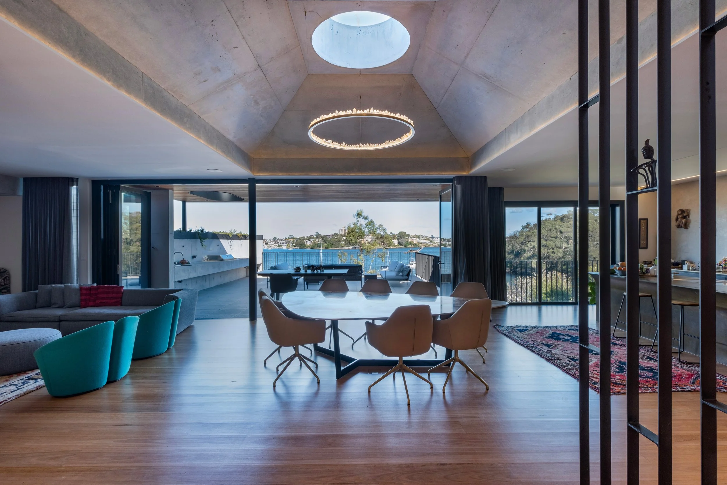 Forming a central element of the home, the stunning dining space sits under a beautiful feature skylight and statement suspended light. This area embraces its connection with the harbour view, and adjacent living areas, all converging at the focal point below the circular skylight, the central space of the haven for the owners.