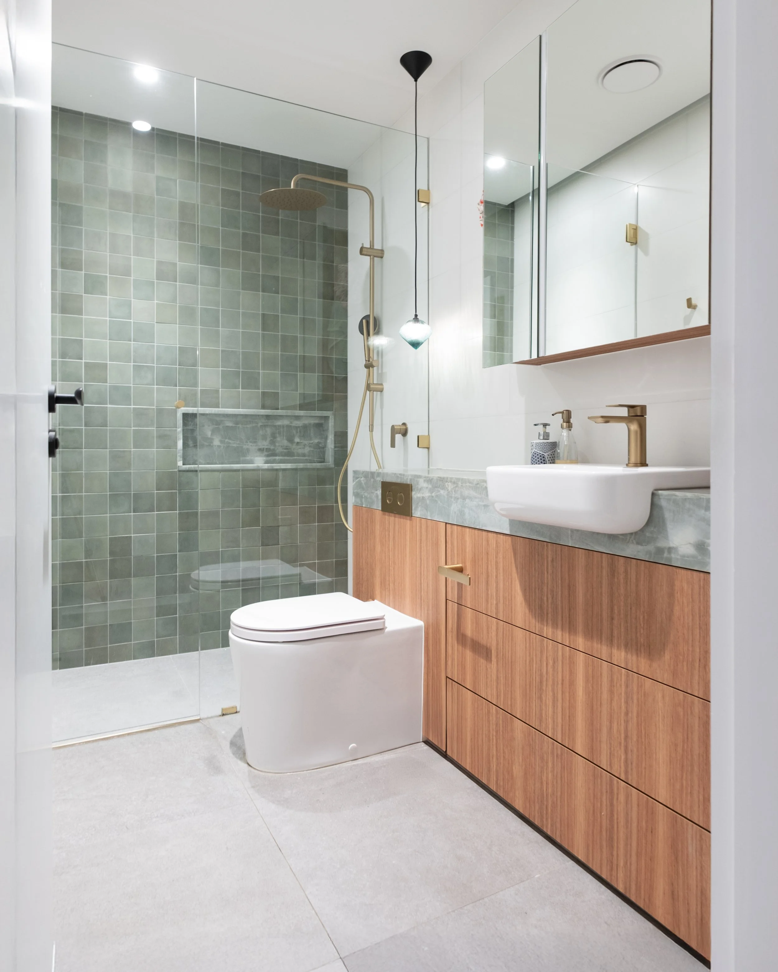 Material selection forms a core component in transforming the property into a dwelling of timeless and organic character. Timber is the hero, the natural oiled blackbutt timber cladding used externally will develop a silver patina, whilst the same timber used extensively indoors brings a rich warmth to the ambience of the family spaces. Timber is accompanied by splashes of stone, brass, hand glazed tiles and steel detailing.