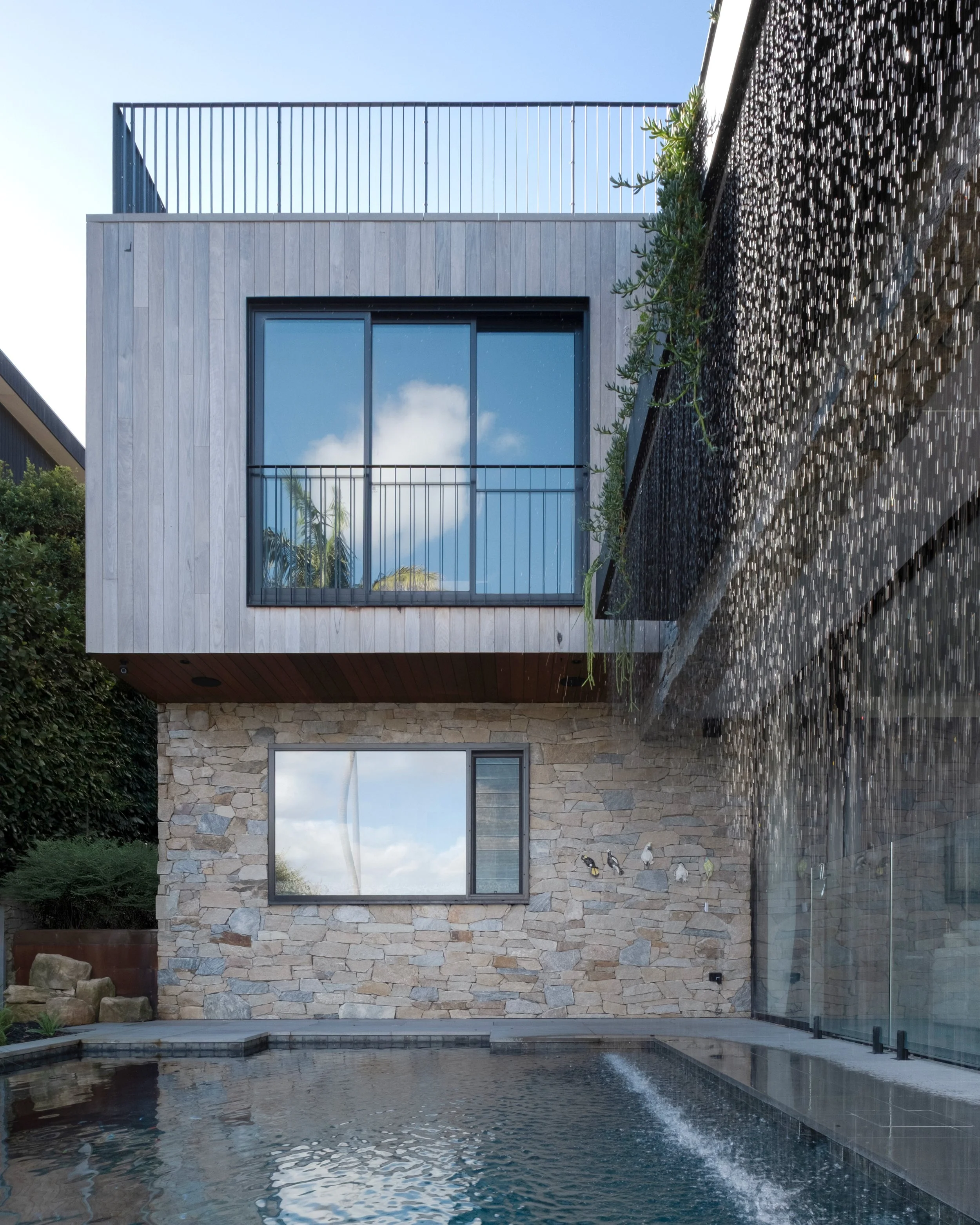 Technology is integrated into this home to help make life easy and delightful. Clever features include the automatic flip up door for the robot vacuum cleaner, a concealed television that rises out of the joinery, a glass lift with gorgeous murals created by the owners, and a stunning rain curtain from the house to the pool.